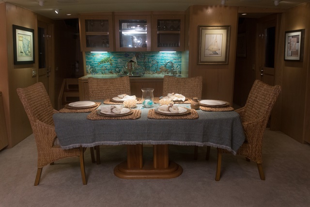 Forward, the formal dining area boasts high back chairs and service area, perfect for entertaining. Separate and forward on the main deck, the full beam, country style marble topped galley, is perfect for casual meals or coffee, offering a breakfast bar and complete dining table.