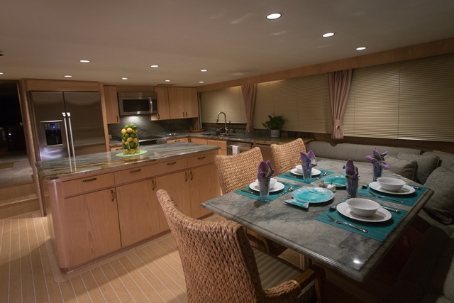 Separate and forward on the main deck, the full beam, country style marble topped galley, is perfect for casual meals or coffee, offering a breakfast bar and complete dining table. SUMMER SPLENDOR is a raised pilot house design, ...