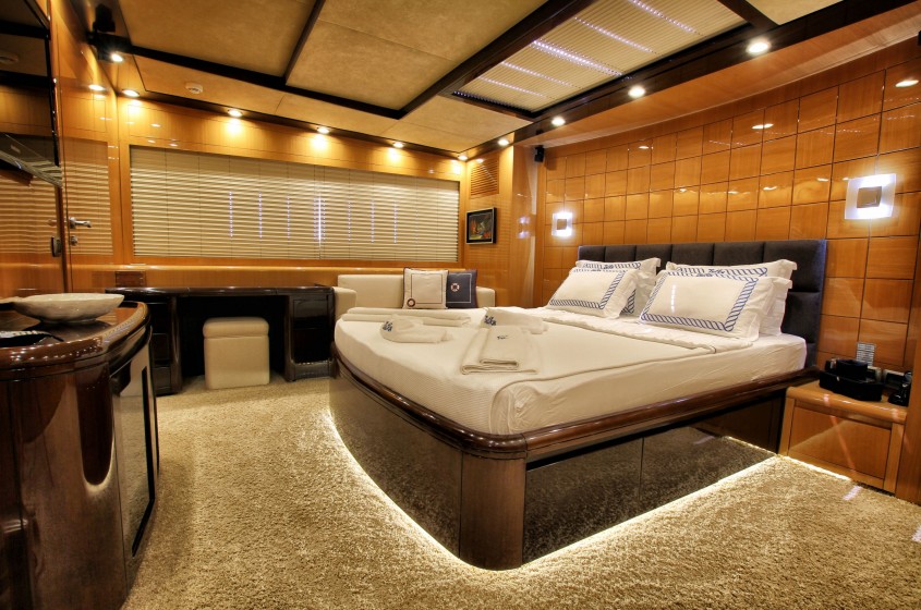 Guest accommodation is in 5 en-suite cabins on 2 decks. The master stateroom is forward on the main deck and full beam of the yacht, with a king size bed, vanity, walk in wardrobe and full entertainment system. Below decks are 2 VIP cabins, both boasting king size beds, vanities and walk in wardrobes.