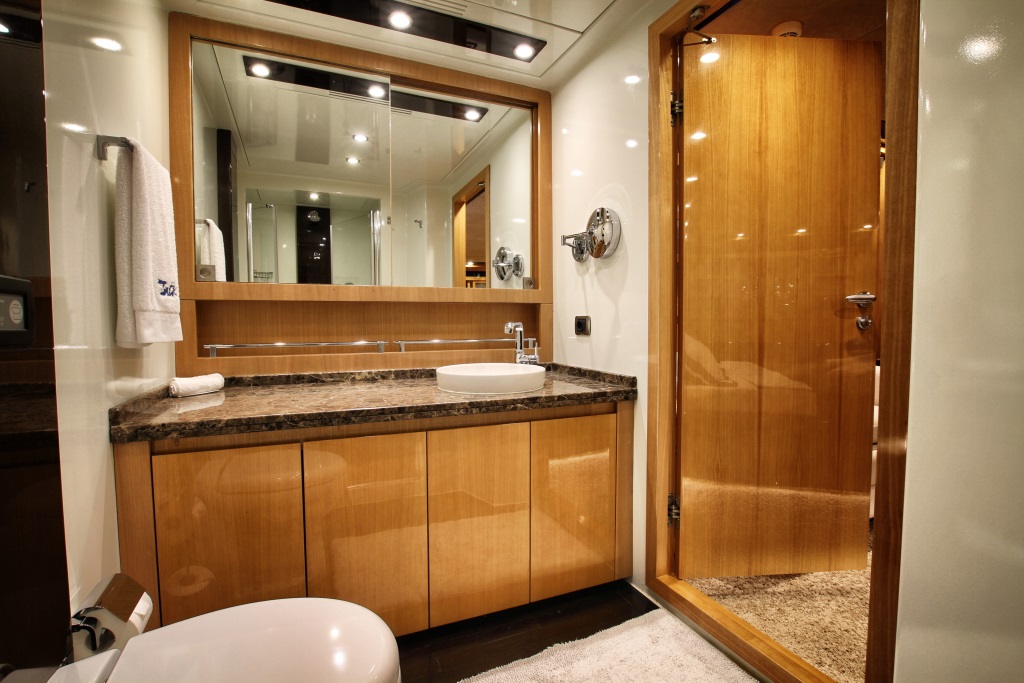 On the main deck, forward of the salon, is the full beam master stateroom, with king size bed, vanity and walk in wardrobe. Below decks, 2 VIP cabins offer king size beds, vanities and walk in wardrobes. A further 2 guest cabins have side by side twin beds. All 5 cabins feature full entertainment systems, have a stylish neutral decor.