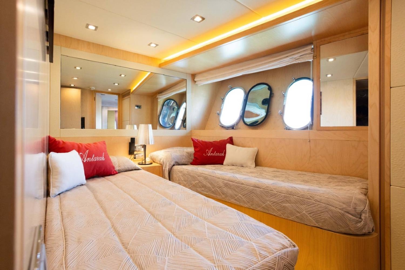 The striking Maiora 27 luxury yacht ANTARAH provides elegant and spacious accommodation to up to 9 guests in 4 well-appointed cabins, including a master cabin, one VIP cabin, and one double cabin with a Pullman berth and one twin guest cabin.