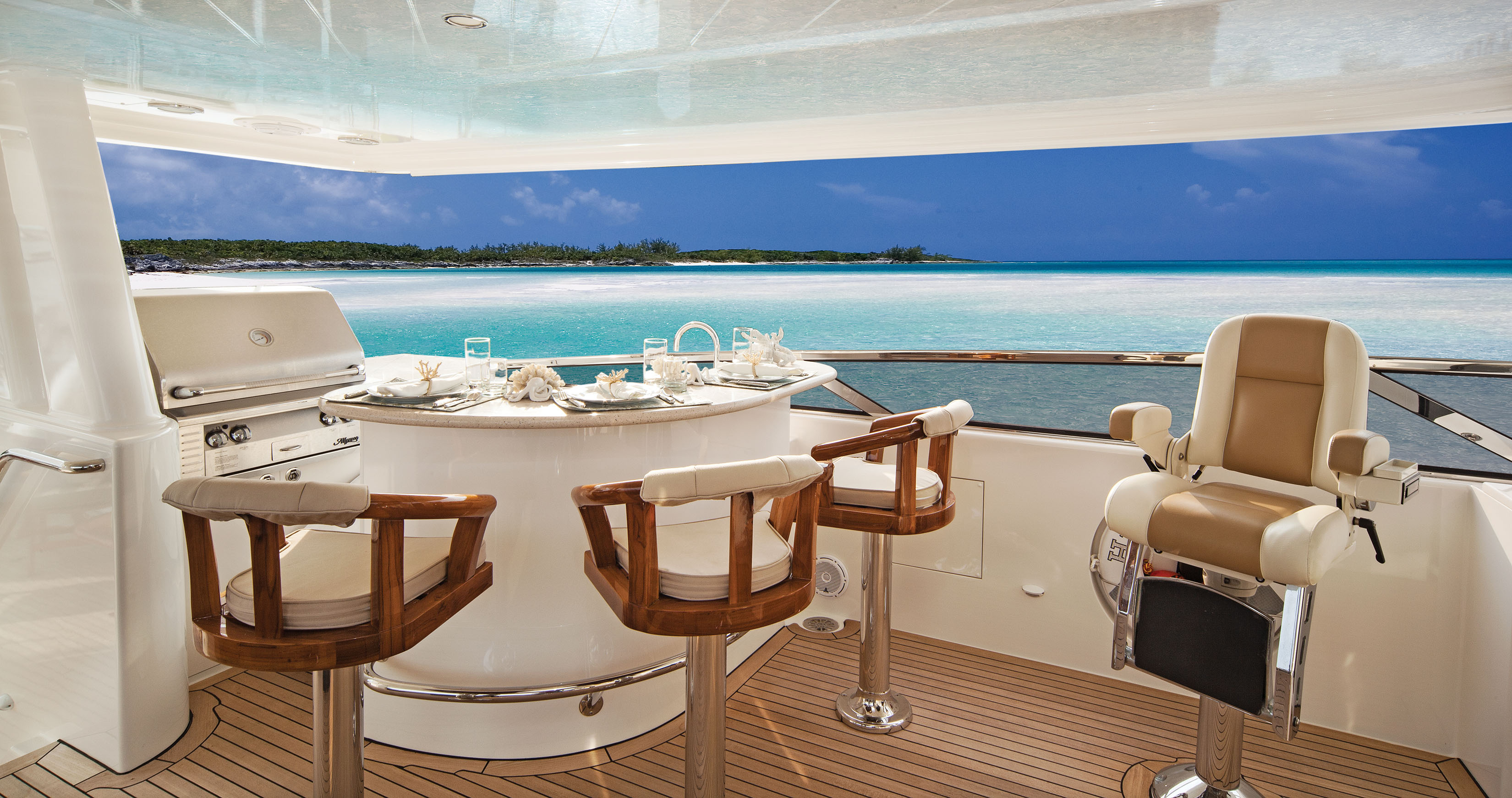 On the main deck, adjacent to the salon is a large shaded aft deck, with seating, alfresco dining option, wet bar and drop down TV, perfect for casual and formal entertaining. The foredeck features a circular seating space, great for a quiet moment.