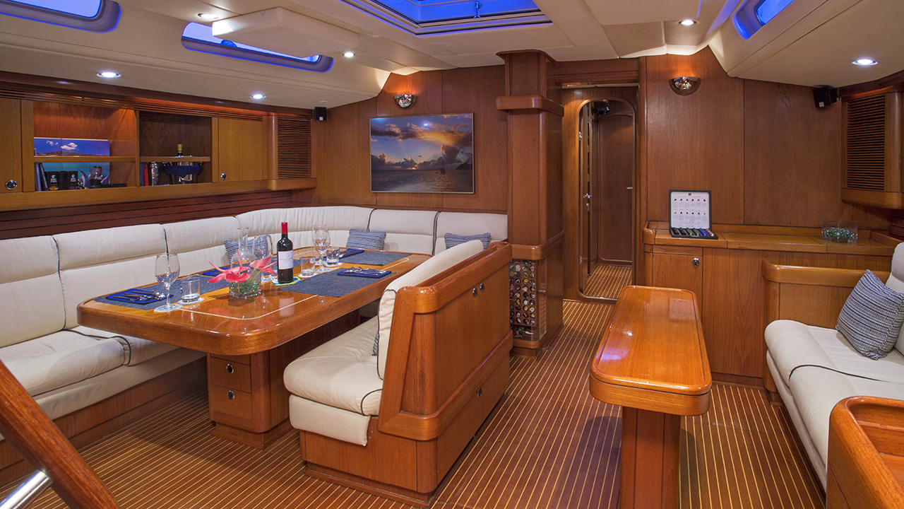 The salon and dining is an open plan, offering a large settee with formal dining to port and a relaxing sofa to starboard, with full entertainment system. Aft of the salon is the master cabin, with double and single bed, while ...