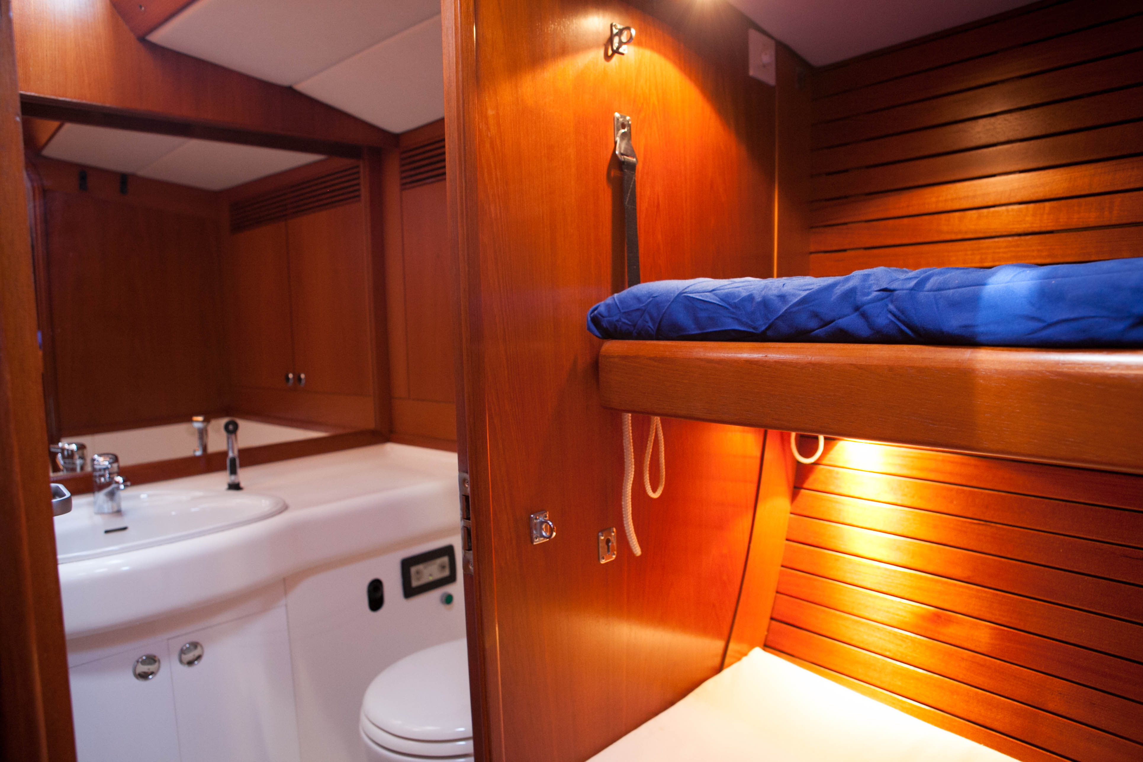 Aft of the salon is the master cabin, with double and single bed, while forward there are 2 guest cabins.