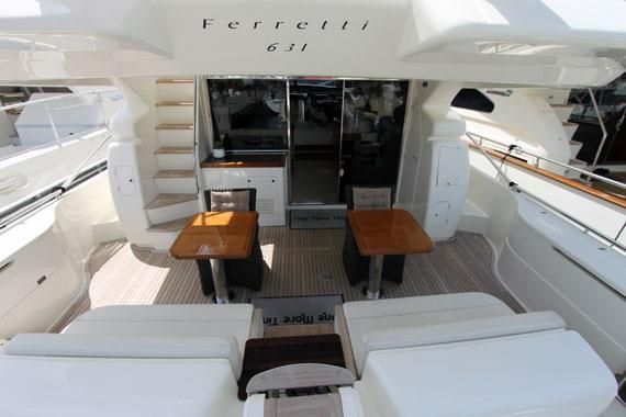 Ferretti motor yacht ONE MORE TIME has plenty of exterior deck areas to enjoy. The aft deck is shaded and features seating and an alfresco dining option.
