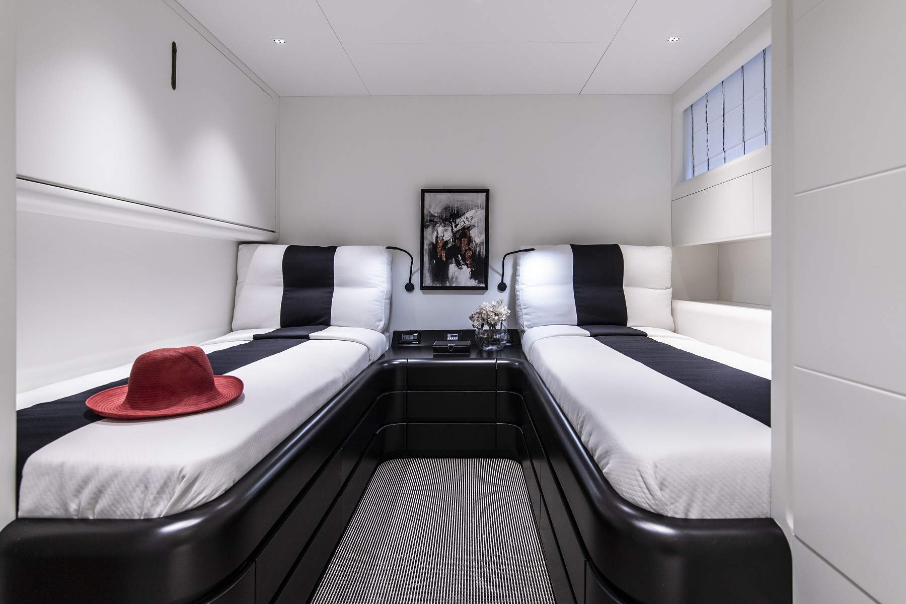 Further forward, the VIP suite is on the main deck, full beam of the yacht. Below decks, the full beam master suite is amidships, with a further double cabin and 2 twin cabins.