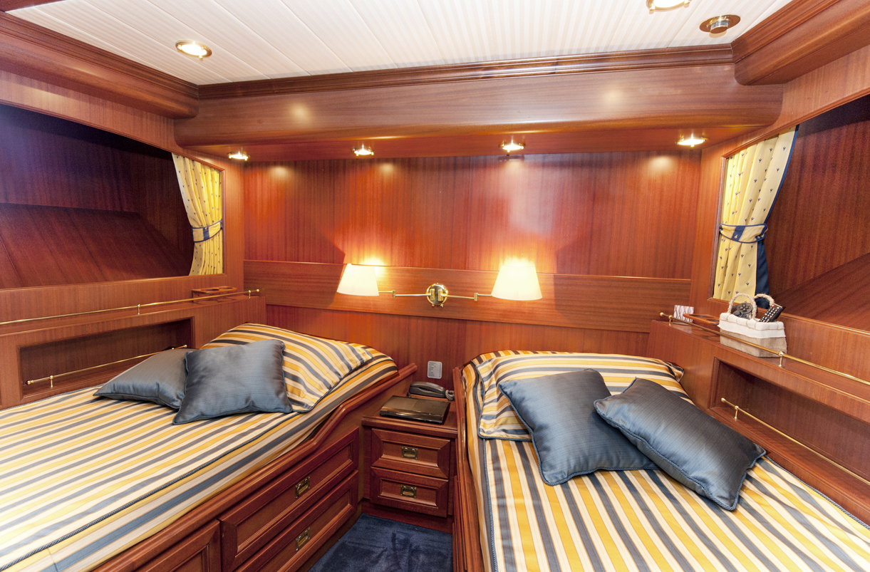 The yacht has a rich interior of fine woods throughout. Her furnishings boast a warm welcome ambiance, with an elegant statement.