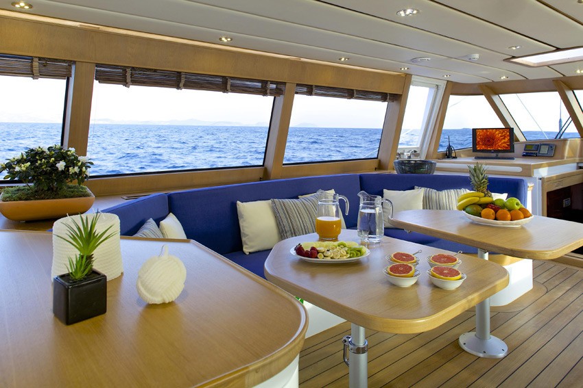 A partially enclosed bridge deck offers comfortable seating and alfresco dining, while boasting idyllic views from surrounding windows. Further aft, the spacious teak decks features great seating and sunning options, followed by dual port and starboard transom steps, leading to a well-appointed swim platform and easy access swim ladders.
