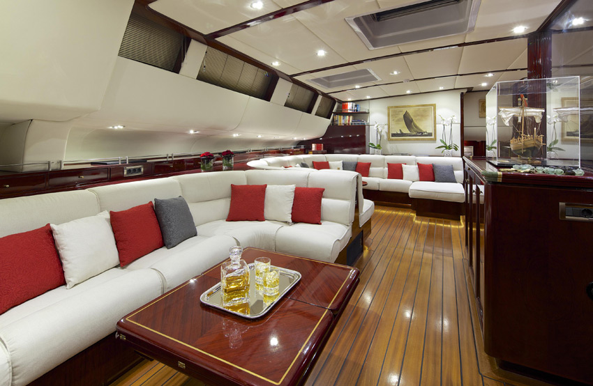 The salon and dining is a contemporary open plan, with the spacious lounge on starboard and formal dining to port. Luscious deep red wood finishes are complimented by crisp white soft furnishings, light cream headliner and honey toned plank wood floors. The entire space is welcoming and perfect for entertaining.