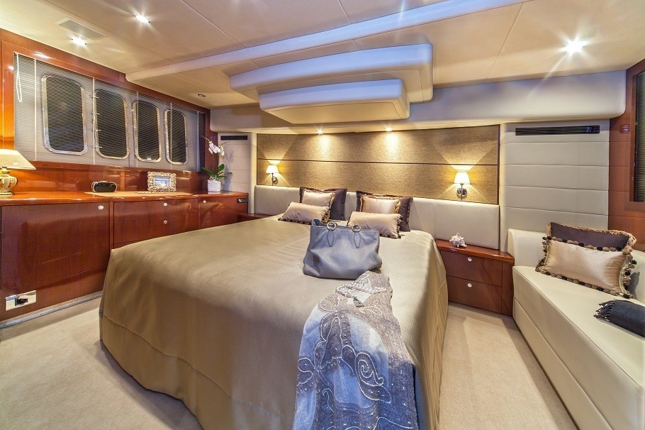 The VIP cabin is forward and full beam of the yacht with a center lined double bed. A guest cabin offers 2 side by side twin beds, while a further guest cabins has upper and lower single beds. The SASSY Charter yacht has the following Tenders & Toys: A New Williams 325 jet tender 104 hp - 2013.