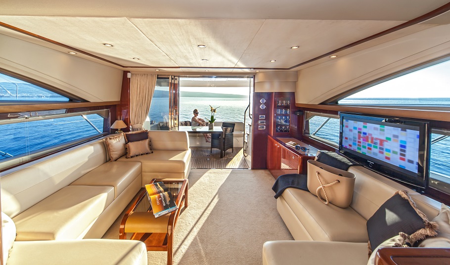 The salon features a generous lounge aft with 2 sofas, coffee table and drop down entertainment system. Forward, the raised formal dining table seats all guests with ease. Thanks to the panoramic windows from fore to aft, the space receives plenty of natural light, while providing spectacular views.