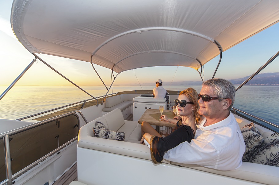The flybridge boasts a further alfresco dining option, seating, Removable Bimini and sunning area.