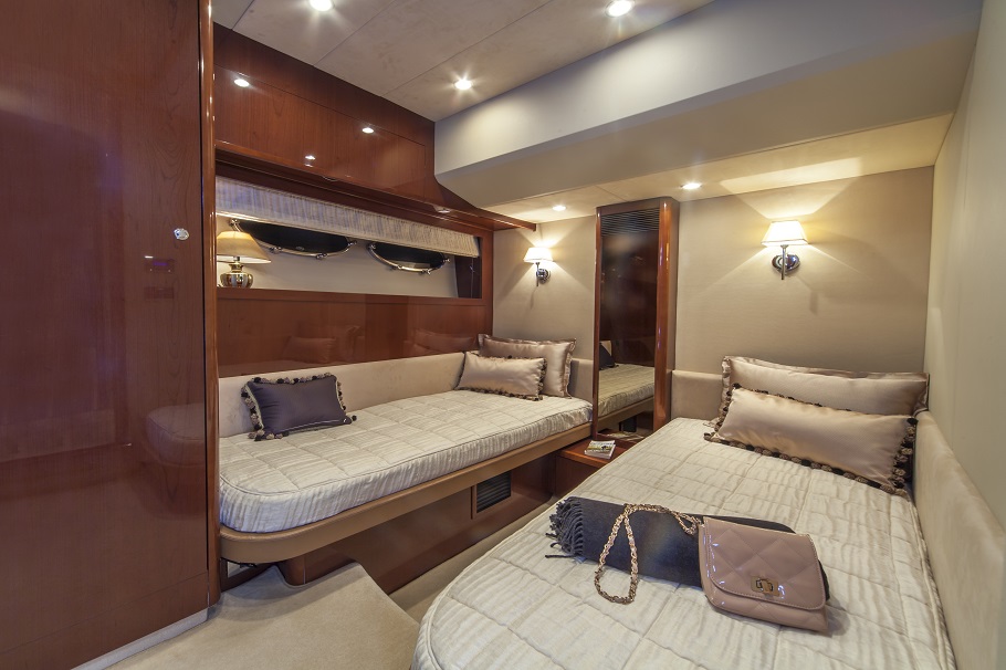Crewed luxury charter yacht SASSY offers 4 stylish cabins, for up to 8 guests. The master suite is full beam of the yacht amidships, featuring a queen size bed, large vertical hull windows, TV entertainment, vanity and sofa. The VIP cabin is forward and full beam of the yacht with a center lined double bed.