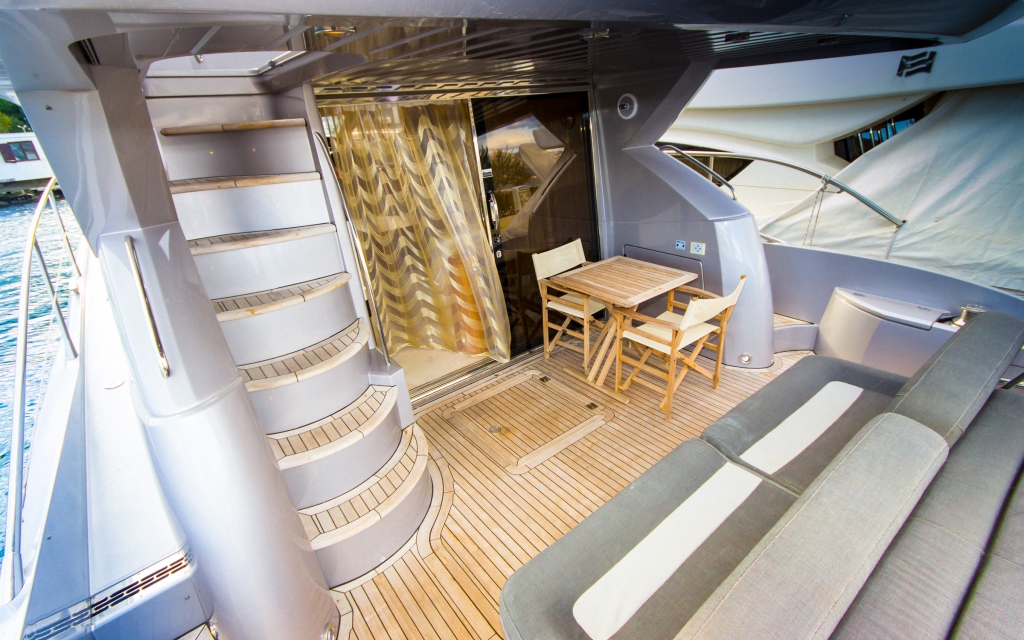 Exterior deck space aboard the yacht NIMADO is plentiful on 2 levels, with ample sunning and relaxing to enjoy. The aft deck is adjacent to the salon and boasts comfortable seating, an aft sunpad and partial shade.