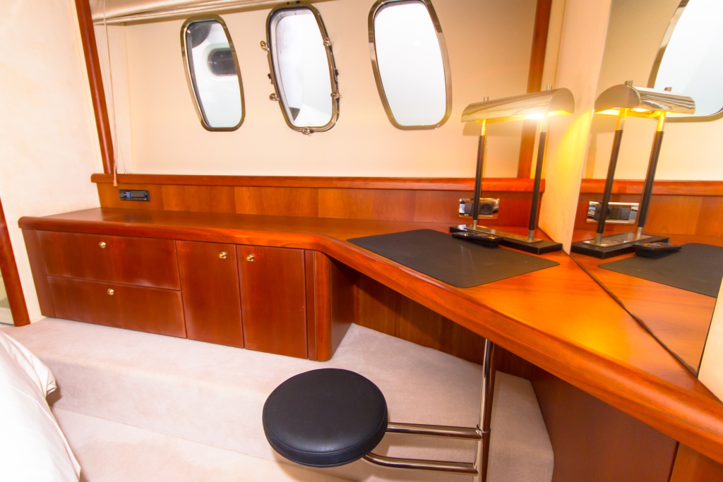 With a beam of 4.63m (15.18ft) and a draft of 1.26m (4.3ft), the performance motor yacht NIMADO is powered by 2 MAN 800hp engines, capable of 23 – 32 knots. The NIMADO motor yacht offers accommodation for 6 charter guests in 3 guests cabins. The master stateroom is amidships and full beam of the yacht, with a king size bed and vanity.