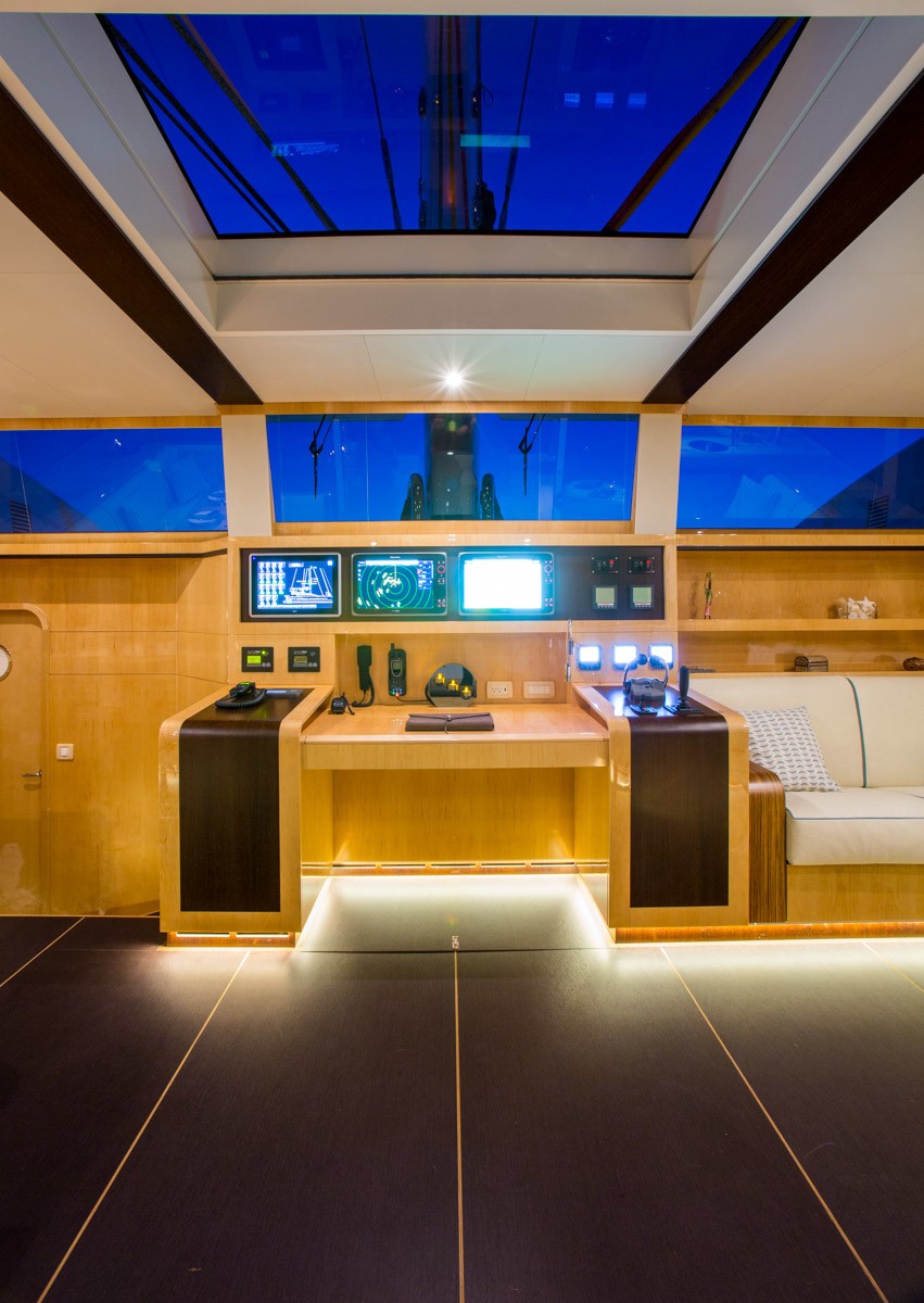 For the water enthusiasts, a walk over aft deck joins the 2 wide transoms and swim platforms, enabling effortless water access. Side decks lead forward to a capacious foredeck, 2 large trampolines and the master suite’s private balcony, which is also accessed directly from the master suite via internal steps.