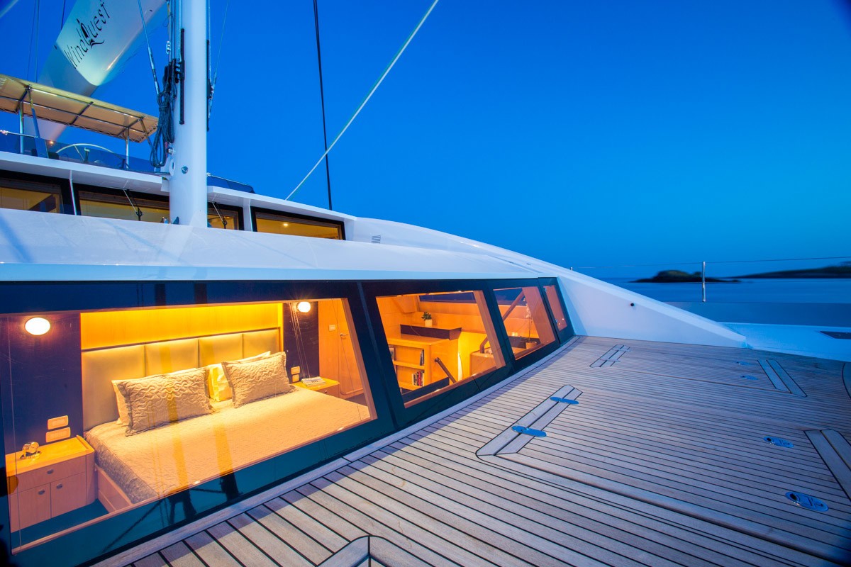The master suite is forward of the salon, with a center lined king size bed, 180° views, large en-suite with his and hers sinks, TV entertainment, sofa, vanity and private balcony. On the starboard side aft, is a guest double with queen size bed. A further 2 guest cabins are on the port side, with a queen size bed each.