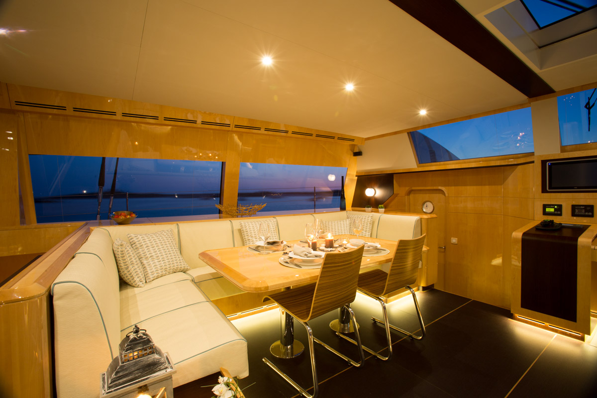The contemporary and stylish salon is surrounded by panoramic windows and features a lounge and wet bar on the starboard side, with formal dining to port. Guest accommodation is in one master suite forward of the salon, 2 guest cabins on the port side and 1 guest cabin on the starboard side.