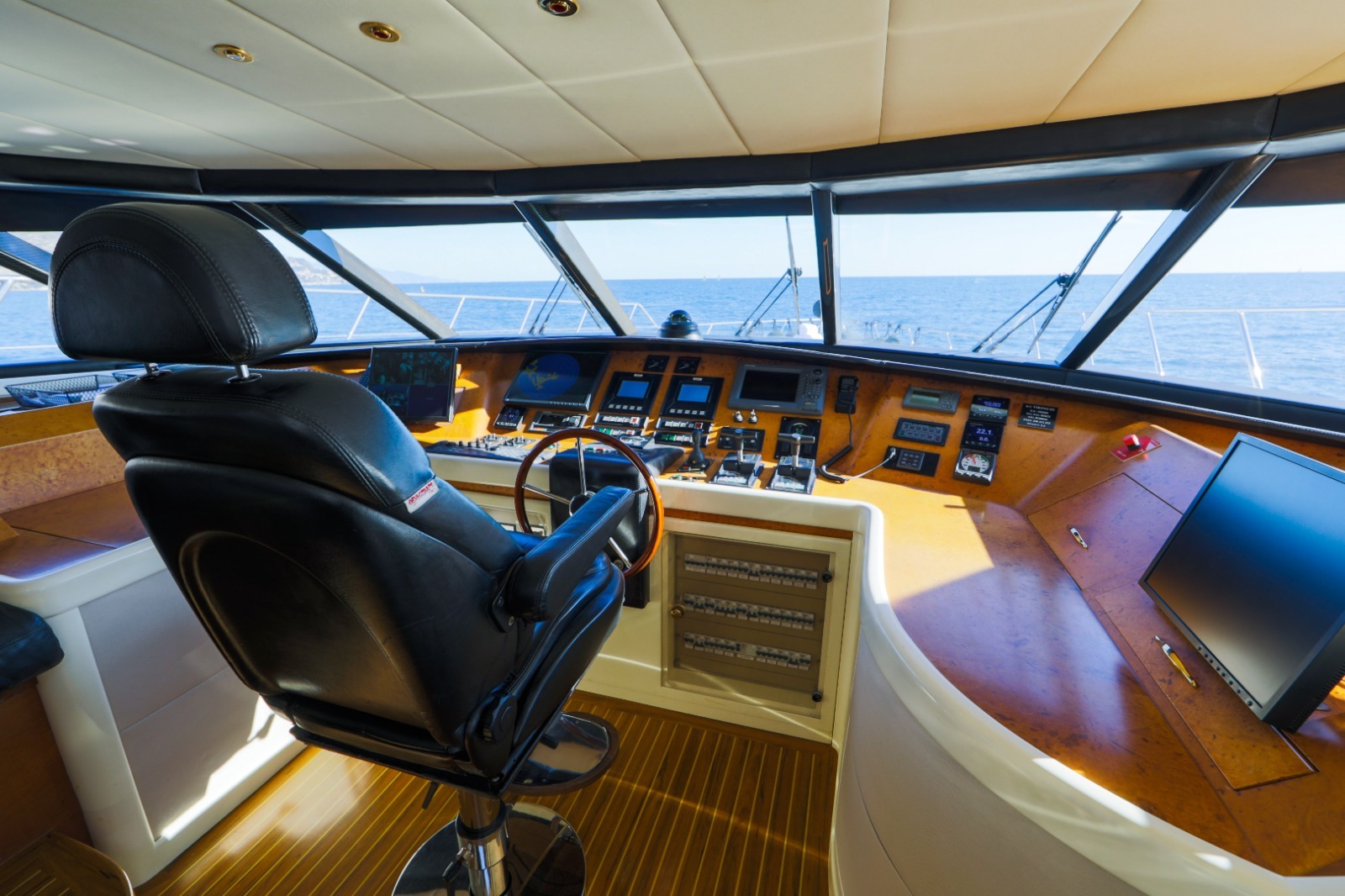 Above the main deck, the flybridge offers generous sunning and entertaining options including, co-captain seating, a full alfresco dining table, cocktail seating, complete varnish topped wet bar with stools, large Spa Pool tub ...