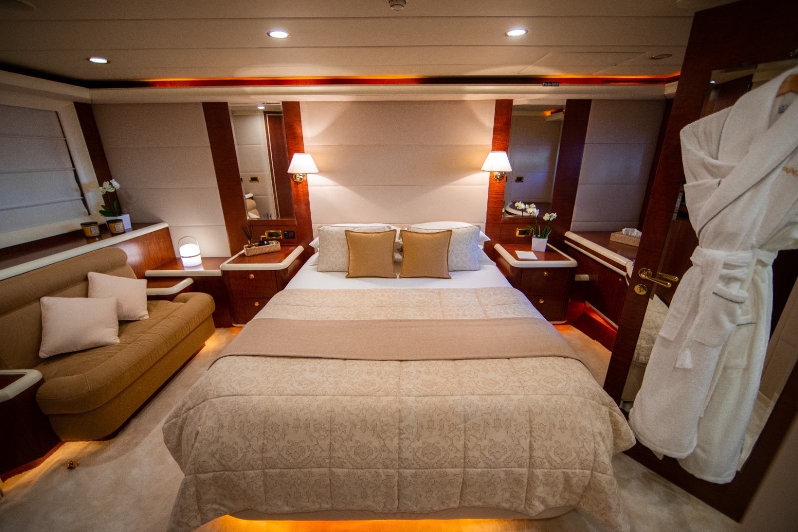 Forward of the salon and dining, is the galley, followed by a private entrance into the full beam master stateroom, complete with sofa, vanity and en-suite facilities with his and hers sink and hot tub.