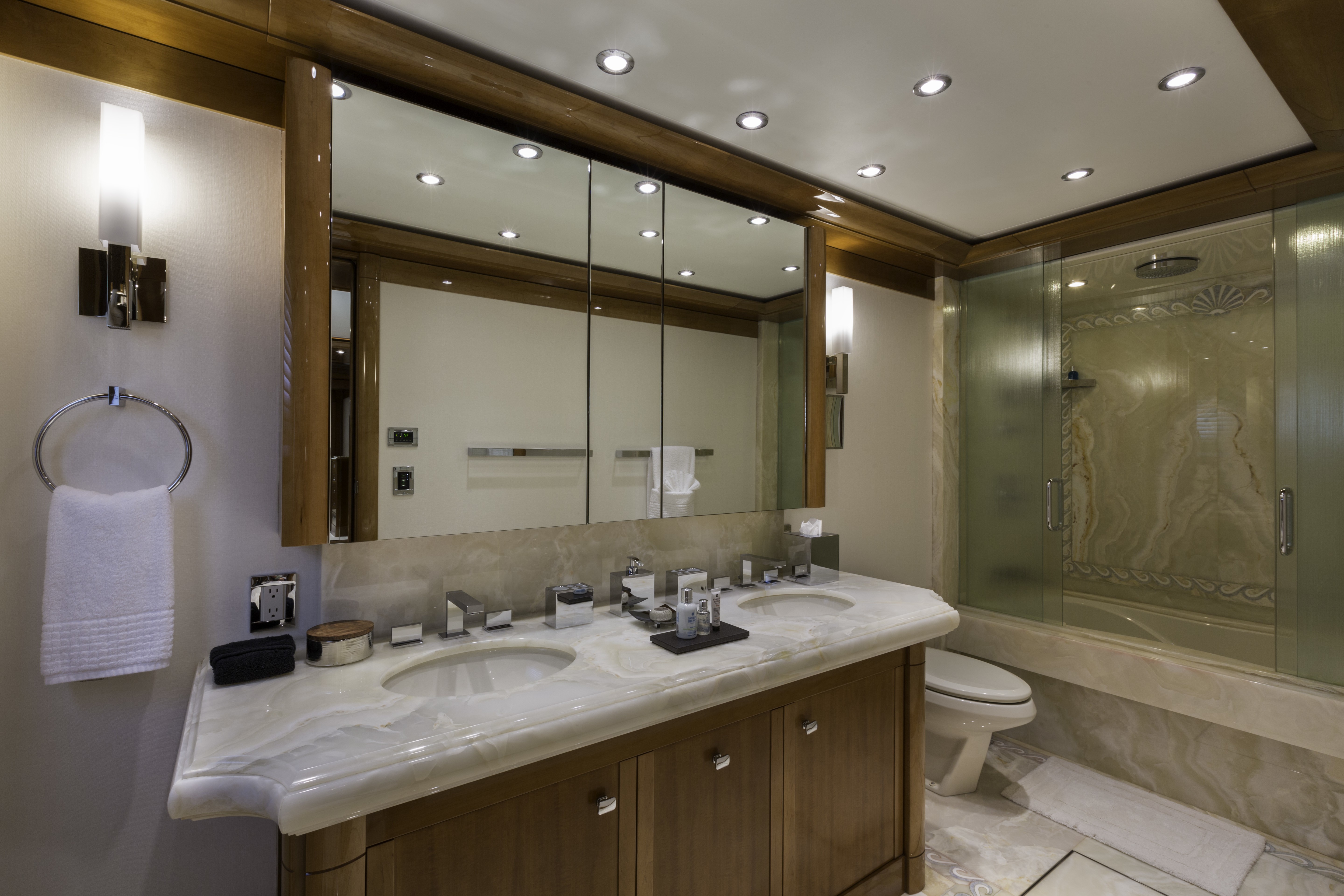 The upper deck features an adjacent aft deck from the sky lounge, complete with an alfresco dining option, seating, entertainment and partial shade. The upper deck wraps around offering 360° access, leading forward to a massive sun pad, which easily converts into a further alfresco dining option.
