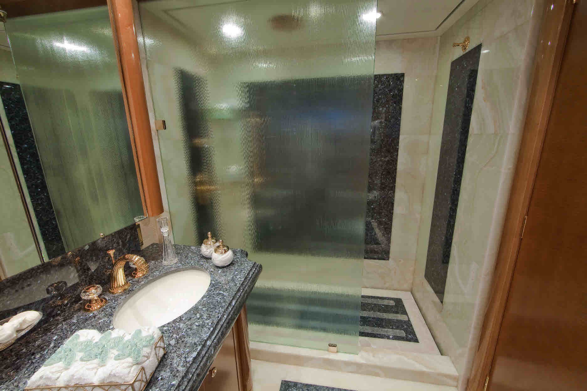 Motor yacht AQUAVITA can accommodate up to 12 charter guests in 6 spacious cabins, all offering private en-suite facilities. The master stateroom is on the main deck, forward of the main salon and marble foyer, featuring a separate study, followed by a full beam cabin, with king size bed, ample storage and generous en-suite.
