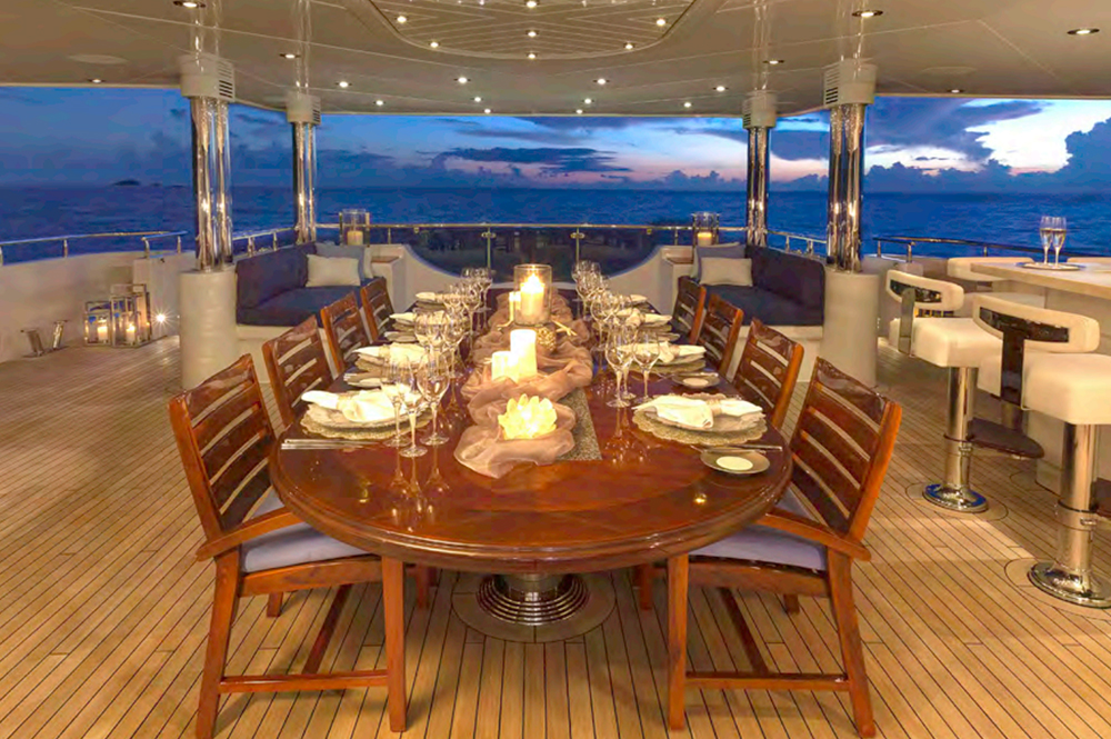Motor yacht AQUAVITA delivers on exterior living space. The main deck offers direct access from the adjacent salon aft, where guests may dine alfresco and enjoy an evening cocktail from the wet bar.