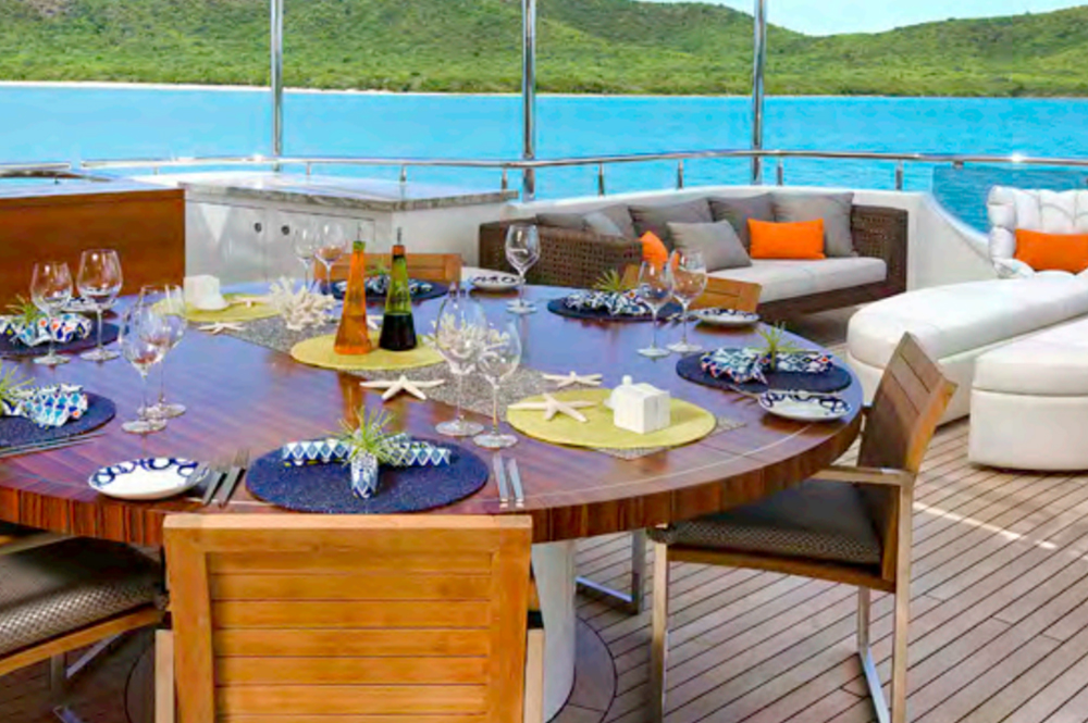 Motor yacht AQUAVITA delivers on exterior living space. The main deck offers direct access from the adjacent salon aft, where guests may dine alfresco and enjoy an evening cocktail from the wet bar.