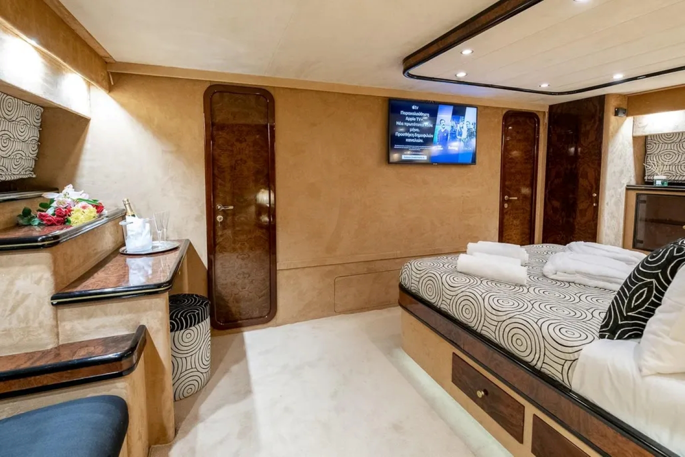 The master stateroom is on the main deck, forward of the main salon and marble foyer, featuring a separate study, followed by a full beam cabin, with king size bed, ample storage and generous en-suite. The VIP cabin is on the upper deck, forward of the sky lounge, boasting a king size bed.