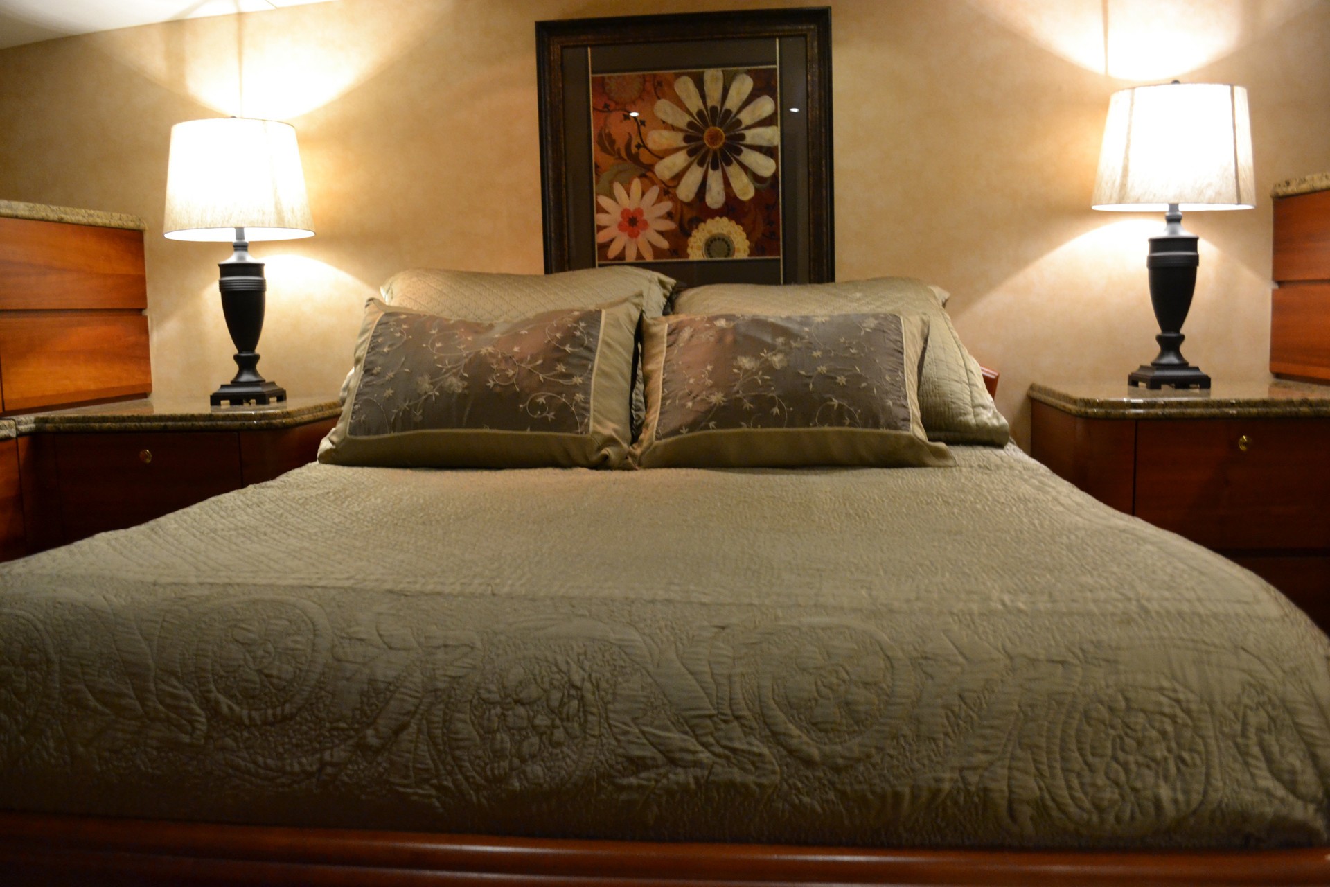 Guest accommodation is below decks aft, in 1 master suite and 2 guest cabins.
