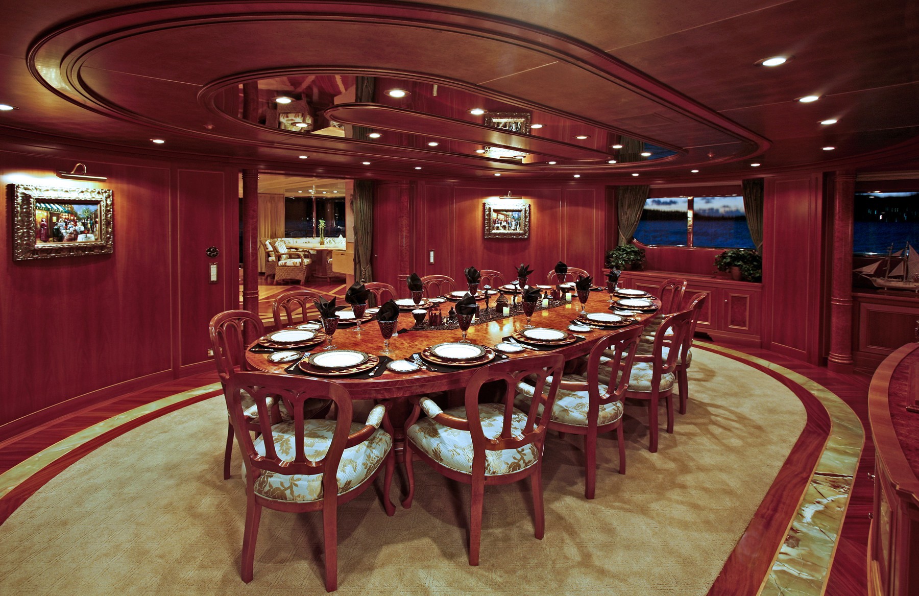 Dining on Te Manu is an absolute pleasure. The main dinning room is elegant and oval-shaped, panelled in gloss cherry with burr veneers. The oval shaped table is set with the finest crystal and ...