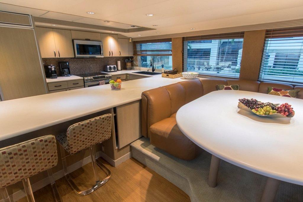 On the main deck is an open-plan salon and dining, offering a large L shaped sofa and coffee table on the starboard side and complete marble topped wet bar to port. The formal dining is forward of the lounge, seating 6 guests with ease. The foyer on the starboard side leads forward to a generous country style galley and casual dining area.