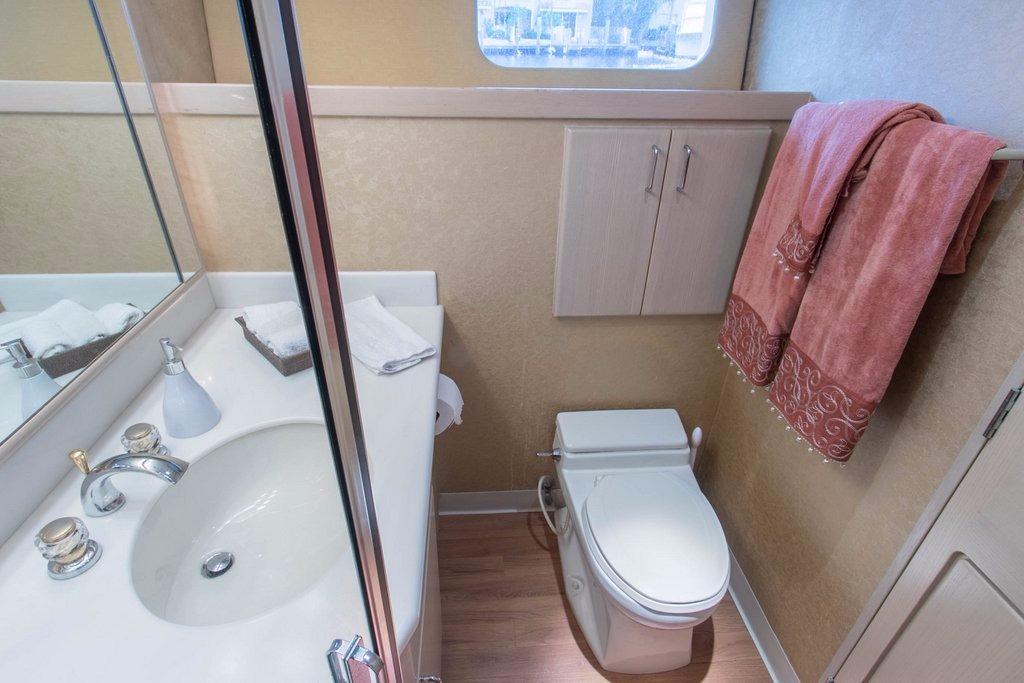 The formal dining is forward of the lounge, seating 6 guests with ease. The foyer on the starboard side leads forward to a generous country style galley and casual dining area. An upper sky lounge boasts a further lounge, entertainment, and additional wet bar.