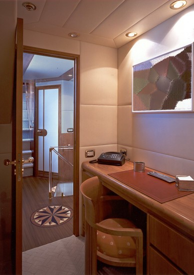 The salon boasts 3 comfortable sofas, coffee table, wet bar and games table. An island credenza gives a sense of separation to the formal dining forward, creating a more intimate ambiance. On the upper deck, the skylounge offers a sofa, occasional chairs, games table and TV entertainment.