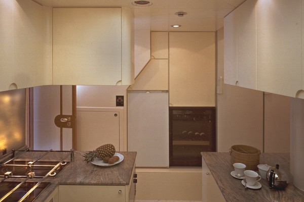 The salon boasts 3 comfortable sofas, coffee table, wet bar and games table. An island credenza gives a sense of separation to the formal dining forward, creating a more intimate ambiance. On the upper deck, the skylounge offers a sofa, occasional chairs, games table and TV entertainment.