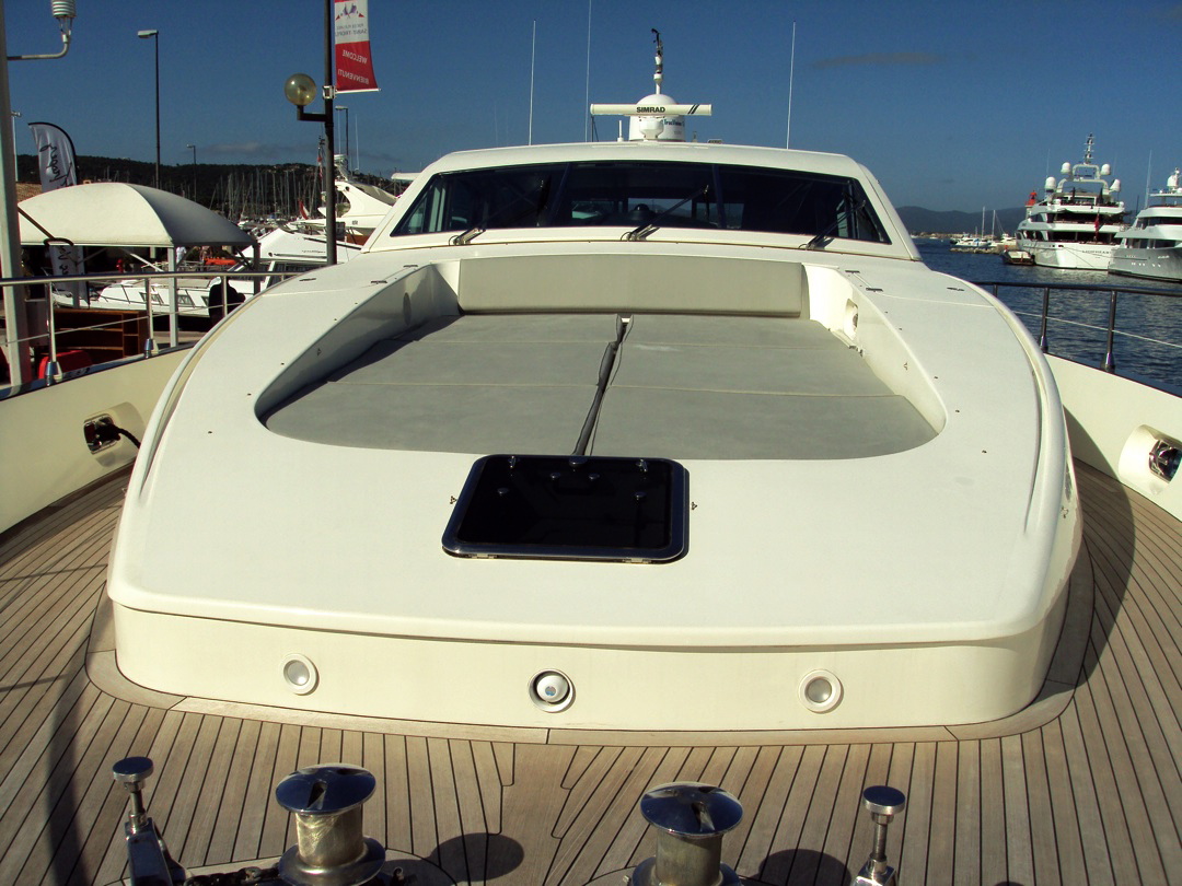Both the aft and foredeck offer triple sunpads, easily accessed by wide side decks on port and starboard. For the water enthusiasts, the extended swim platform is ideal for a quick dip, while a tender garage stows sea toys effortlessly.