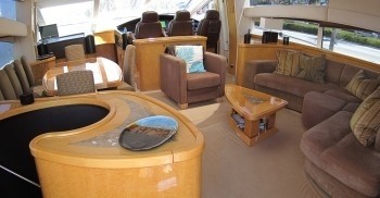 The salon offers a comfortable lounge aft with sofa, an occasional chair, coffee table and entertainment system. Forward, the formal dining area seats guests in style, boasting idyllic views. An overhead retractable roof creates a multi-functional space and is ideal for a romantic starlit dining experience.