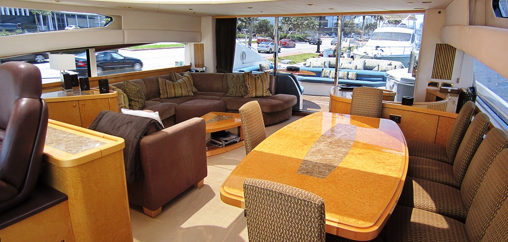 The salon offers a comfortable lounge aft with sofa, an occasional chair, coffee table and entertainment system. Forward, the formal dining area seats guests in style, boasting idyllic views. An overhead retractable roof creates a multi-functional space and is ideal for a romantic starlit dining experience.
