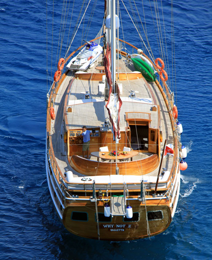 Luxury sailing Gulet WHY NOT 3 was built by Bodrum Shipyard and launched in 2007. Measuring 24m (78ft), the ketch rigged WHY NOT 3 sailing yacht offers accommodation for up to 8 charter guests, in 4 en-suite cabins, sailing the warm azure Balearic waters.