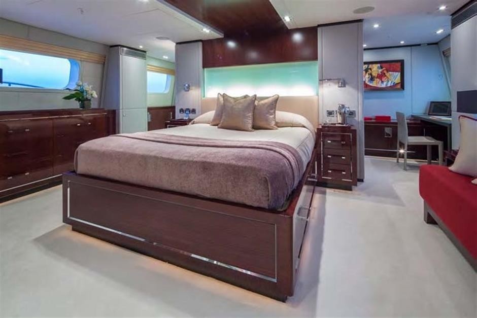 The master suite is forward of the salon area on the main deck, while additional guest accommodation is below decks.