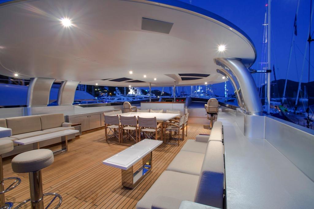 The main salon and dining is a contemporary open plan and offers a wet bar upon entrance through the aft sliding doors, generous lounge with plush sofa, occasional chairs and coffee table, followed by the formal dining space forward. Panoramic windows surround the space, infusing the neutral tones with ample natural light.