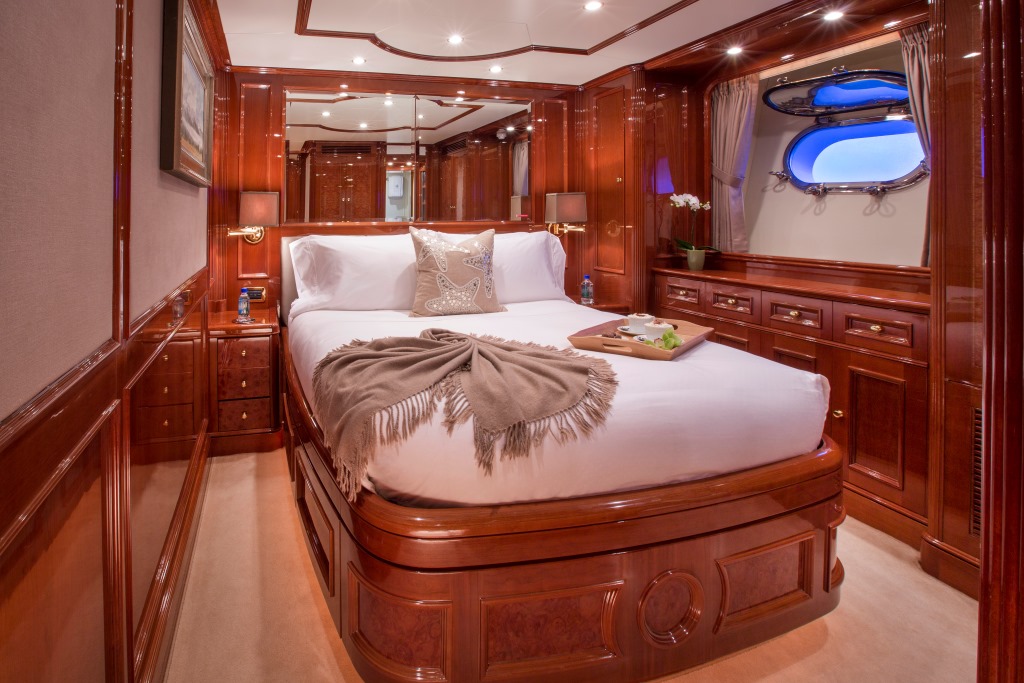 Centered is the guest accommodation foyer to the VIP and 2 guest cabins. Surrounded by panoramic windows, the salon receives ample natural light, while electric sliding doors open out onto the shaded aft deck, creating a fabulous social ambiance.