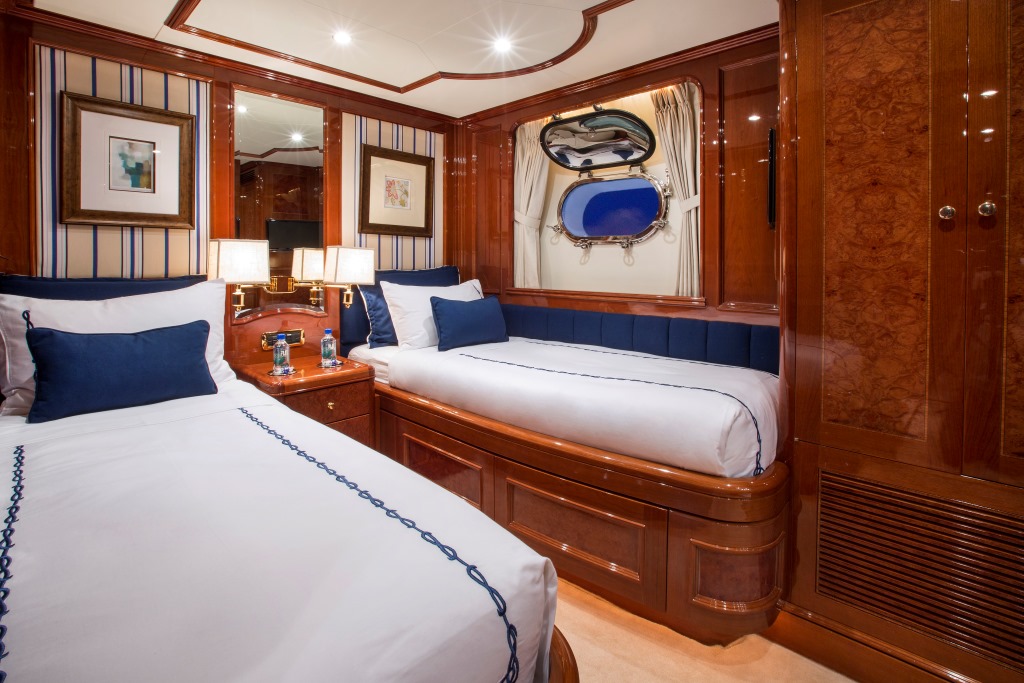A further 2 mirror image twin cabins are aft on port and starboard, each with side by side single beds and an upper Pullman berth each. All guest cabins have TV and music entertainment and large ports for plenty of natural light.