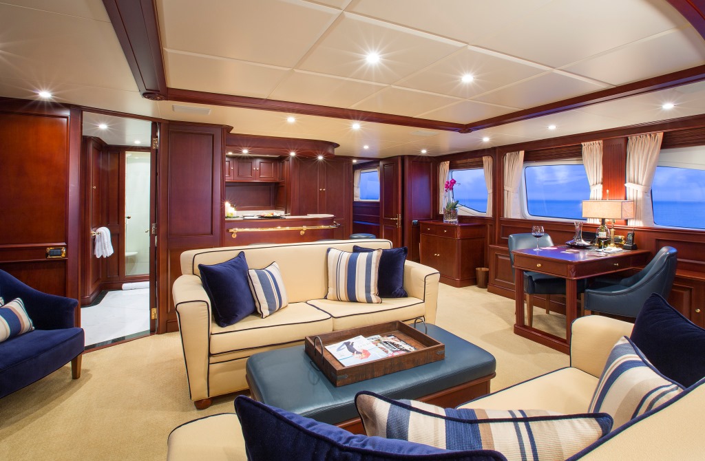 The skylounge aboard the crewed charter yacht CAMARINA ROYALE is aft of the pilot house and boasts a relaxing seating area, games table, full service wet bar and day head with shower. The skylounge offers further fantastic ...