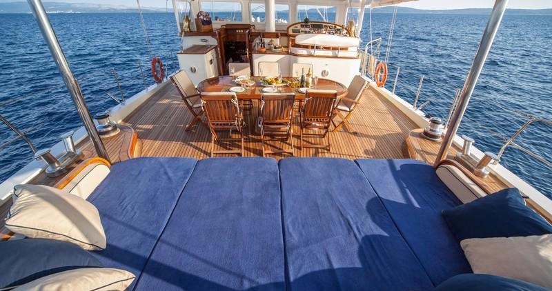 Aboard the ROSA sailing yacht, guests will find ample exterior living with plenty of shade or sun to enjoy, on wide teak decks. The aft deck is very generous and has an alfresco dining area and full beam aft sunpad.