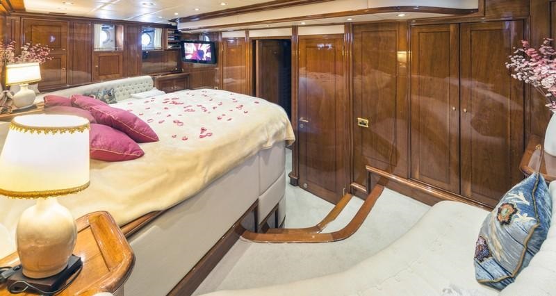 Accommodation is in 5 en-suite cabins, fore and aft of the salon.