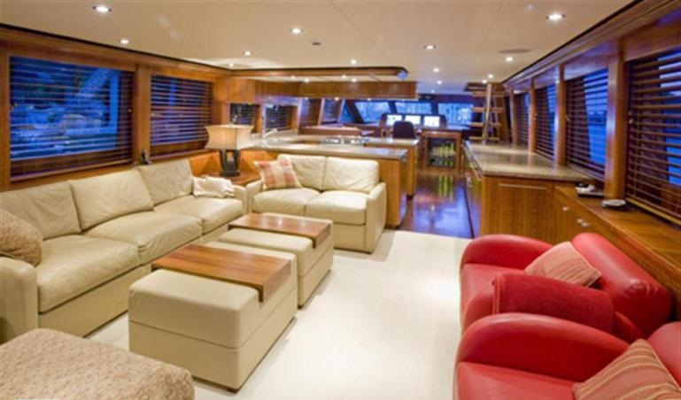 The spacious salon is well appointed, emphasizing a social ambiance. Aft of the salon is the generous lounge, offering 2 sofas, occasional chairs, ottomans and full entertainment. Centered is a modern marble topped open galley, fitted with the finest of stainless appliances. Further forward is the guest dining area.