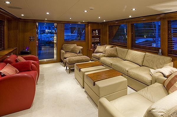 The spacious salon is well appointed, emphasizing a social ambiance. Aft of the salon is the generous lounge, offering 2 sofas, occasional chairs, ottomans and full entertainment. Centered is a modern marble topped open galley, fitted with the finest of stainless appliances. Further forward is the guest dining area.