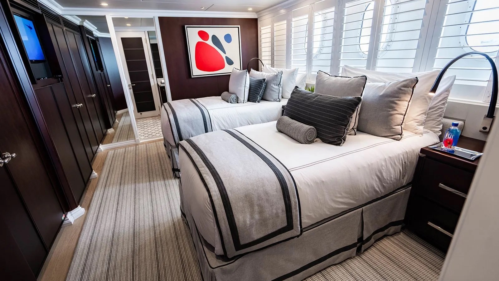 Each of the staterooms has ensuite bathrooms. The master has a king-sized bed, is located on the main deck and includes a private office and his & hers vanity and shower. One of the yacht's VIP staterooms has a king-sized bed and a tub, the other VIP offers a king and a shower.