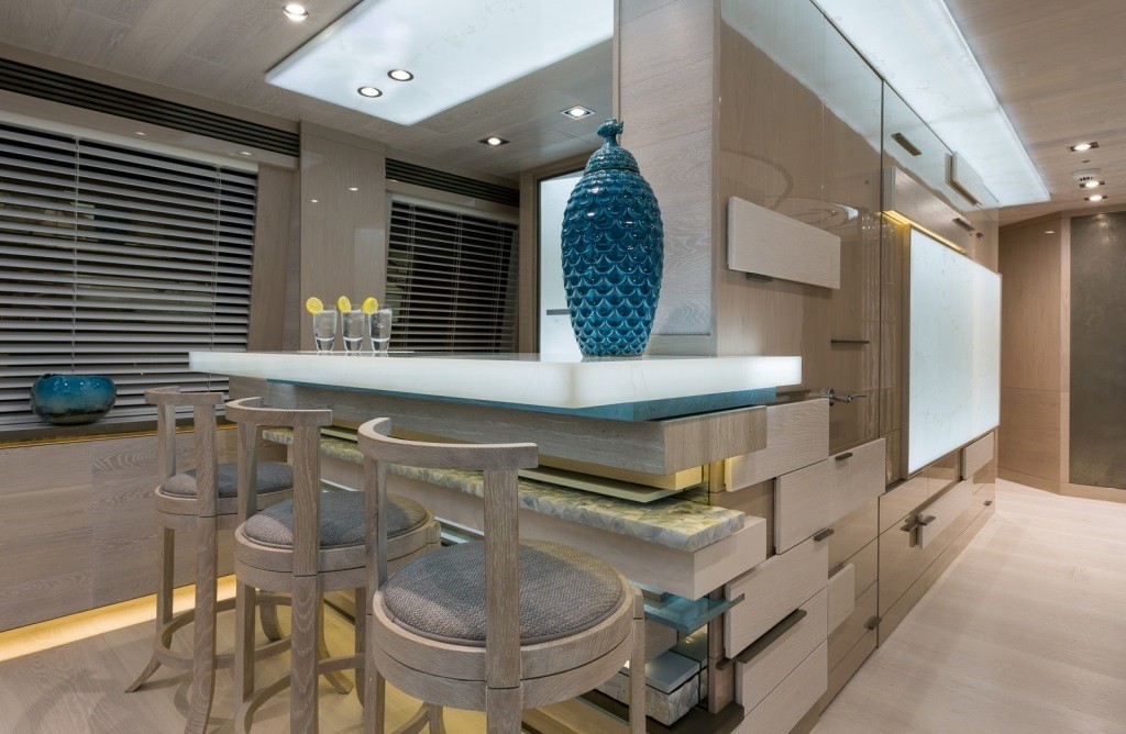 Light and bright interiors create a feel of spaciousness onboard this 40-metre motor yacht. The main salon and sky lounge offer ample entertainment and recreation facilities. There is state-of-the-art entertainment system for some extra fun while cruising onboard Thumper.